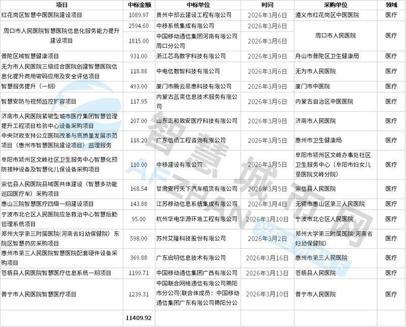 以下是小编为您整理的2026年3月上旬智慧医疗领域相关项目中标情况汇总分析: