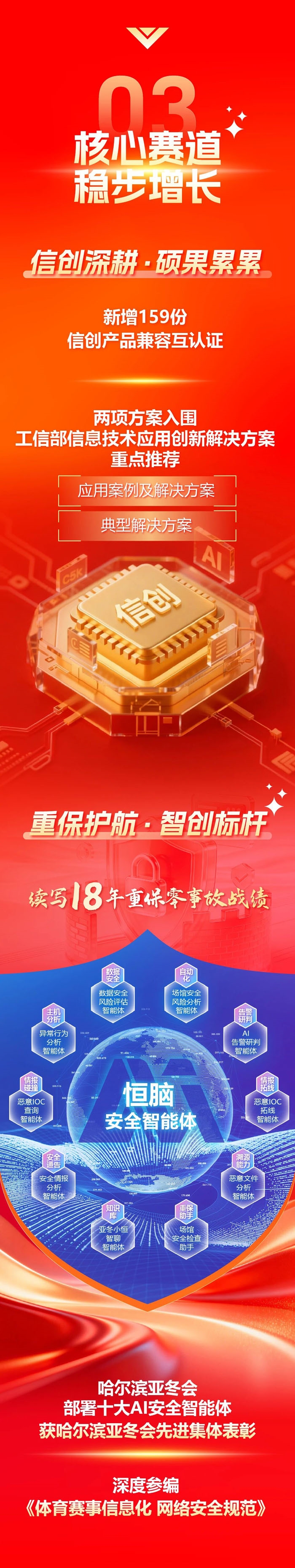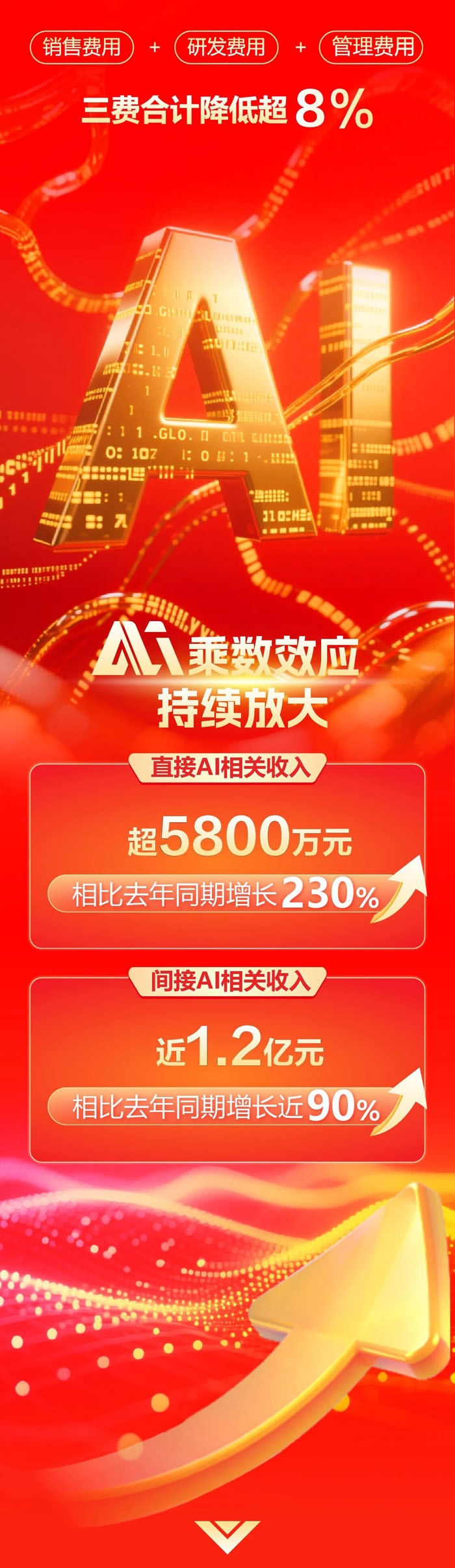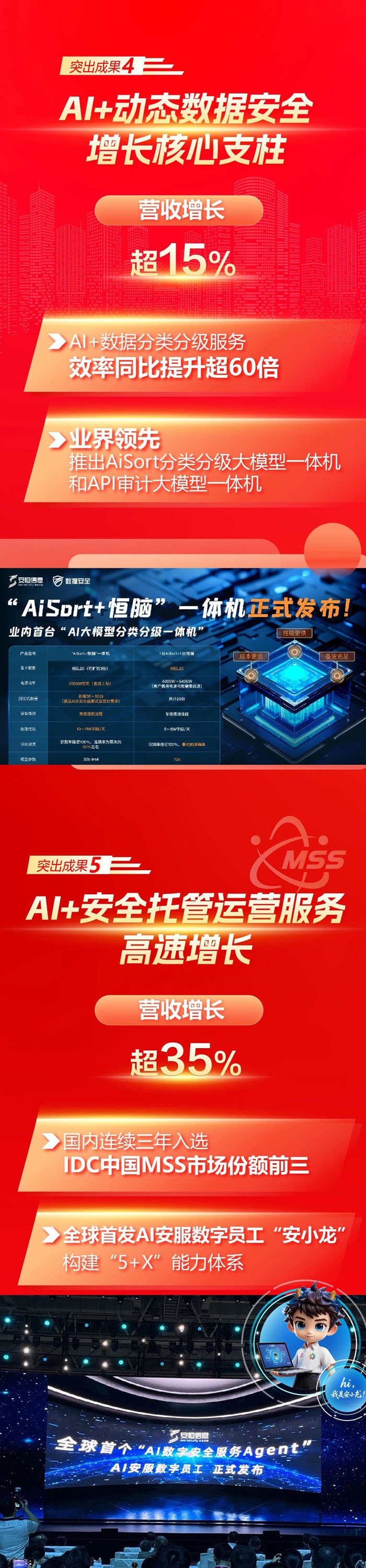 报告期内,公司全面深化AI战略执行,聚焦三大关键领域持续发力:构建全员AI能力体系、驱动产品智能化迭代、引领安全服务AI化转型,形成覆盖 “提质、降本、增效”全链条的良性循环,为业务增长注入新动能。2025年,借助AI驱动的能效提升,公司实现毛利率提升的同时销售费用、研发费用及管理费用三费合计降低超8%,人均效能提升,提质增效成果显著,经营现金净流入大幅增长。未来,公司将持续以AI为核心战略支点,深度赋能各业务条线及业务场景,全面提升组织效能,放大AI的乘数效应。公司实现纯AI 收入超5,800万元,相比去年同期增长超230%;间接AI产品收入(即AI赋能产品后带来的收入)近12,000 万元,相比去年同期增长近90%。