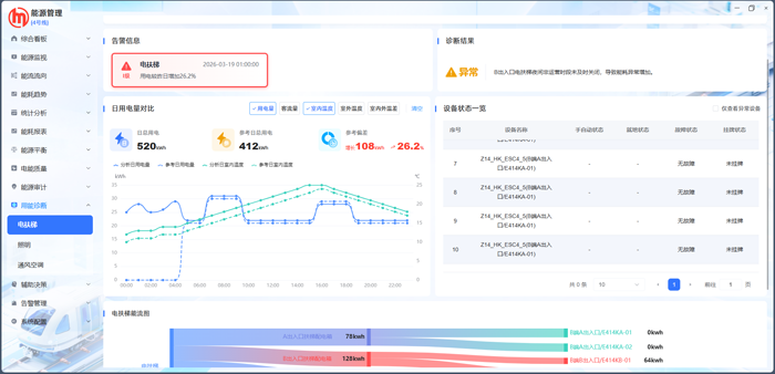 智慧城轨能源管理软件打通城轨车站高低压配电、通风空调、电梯扶梯、照明系统、给排水等各类用能设备的数据壁垒,实现电、水、燃气等全能源类型、全品类用能设备的即插即用式接入,构建全域、全时、全量的能耗感知网络。软件打造可视化能耗监测大屏,以动态图表、数据看板、设备台账等形式,实时呈现各系统、各区域、各设备的能耗数据。基于AI大模型的时序分析和异常检测能力,系统可自动识别能耗突增、夜间异常用电等非典型用能模式,实现能耗数据秒级更新、即时预警。相比传统人工抄表模式集效率提升90%以上,运营管理人员足不出户即可全面掌握全站能耗动态,真正实现能源管控“看得见、摸得着、管得住”。